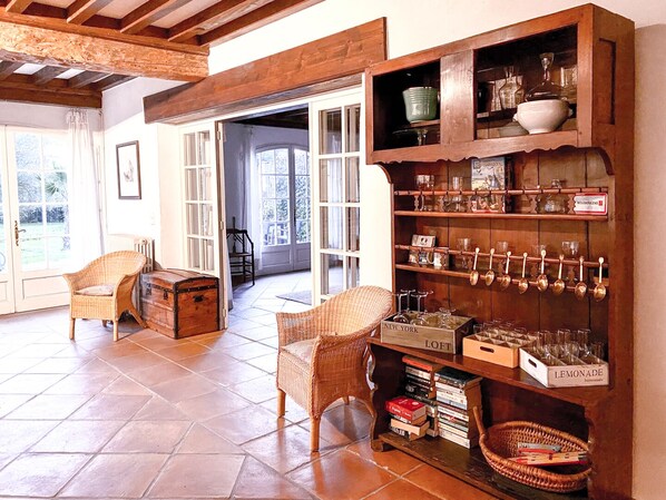 Spacieuse maison de caractère de plain pied (145m2) avec poutres apparentes, joliment décorée avec des meubles anciens et modernes.