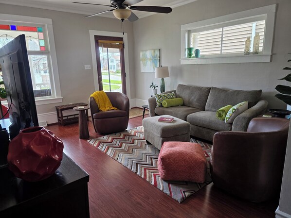 La disposition de la maison à 2 étages est la suivante. Au rez-de-chaussée, il y a un lit king dans la chambre principale. La deuxième chambre à l'étage principal abrite un lit futon complet / double. Au rez-de-chaussée se trouve également le salon spacieux avec une grande télévision à écran plat et de nombreux sièges confortables. Il y a le wifi gratuit et un lecteur DVD. En dépit d'être une maison historique, cette maison bénéficie d'un concept à aire ouverte pour la vie d'aujourd'hui. Située entre le salon et la cuisine, une gracieuse salle à manger peut accueillir jusqu'à 12 personnes. La salle de bain complète entièrement rénovée est idéalement située pour les deux chambres à partager. Et n'oubliez pas l'immense véranda couverte avec des sièges en plein air vous permettant de profiter de tout ce que ce quartier calme a à offrir.