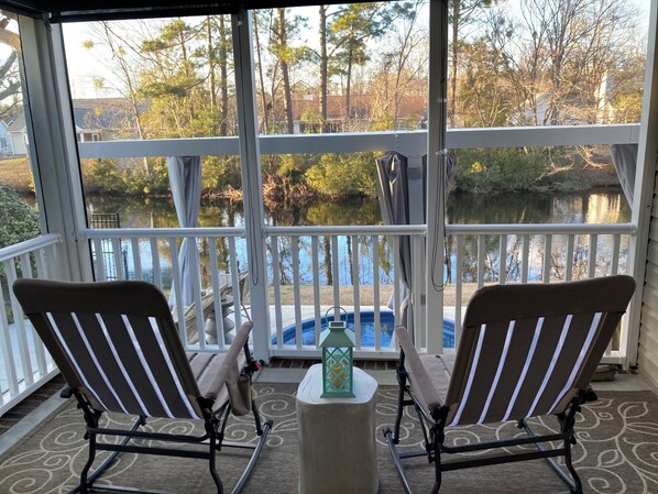 Welcome to Myrtle Beach. Centrally located in a safe, quiet neighborhood with no HOA. 8 miles to the beach, 6 miles to charming Conway & Tanger Outlets, 3 miles to Coastal Carolina University, restaurants and grocery store. 3 bedroom, 2 bath modern home with open floor plan. Lots of windows make the space bright and airy. Large family room with smart tv, fireplace with burning glass, sectional sofa, work area with desk and board games for your enjoyment. Fully equipped kitchen has all the extras and includes stainless steel appliances, dishwasher, filtered water (reverse osmosis), coffee bar with regular coffee maker and espresso machine, kitchen has island with 3 bar stools and dining area has seating for 6. 12x16 Master bedroom with king bed, luxury linens, large walk in closet, lots of storage space and electric fireplace. En suite master bathroom with jetted garden tub, separate shower, double vanity and bidet. Relax on the screened in back porch with rocking chairs, cookout on the gas grill and enjoy the 10 x 20 side patio with hammock and 10 x 20 cabana with plunge pool and chaise lounge on peaceful, small lake. Plenty of free parking for boat or trailer. Operating cameras are outside of the property. There are beach chairs, beach umbrella, boogie board, sand bucket and toys, a cooler, corn hole, golf clubs and 2 bicycles for your pleasure. Please take safety measures around the pool area.