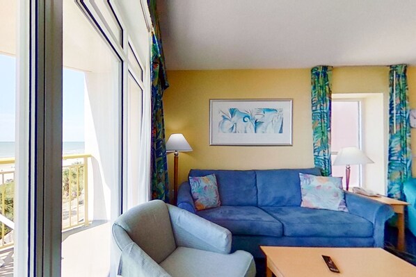 Spread out in comfort and convenience when you book this sun-kissed oceanfront condo for your next vacation to North Myrtle Beach! You'll love waking up with your first coffee while taking in the fresh sea air on the private balcony with ocean views. The free WiFi is perfect for downloading your favorite workout playlists for an hour down at the community gym, and you'll have fun exploring all the other on-site amenities such as the shared pool and hot tub. After an afternoon of sandcastles on a hot summer beach, there's nothing like coming home to bask in the suite's cool central air conditioning while watching a good movie on the flatscreen TV. You'll even have a full kitchen to prepare a delicious meal for tonight's dinner guests!