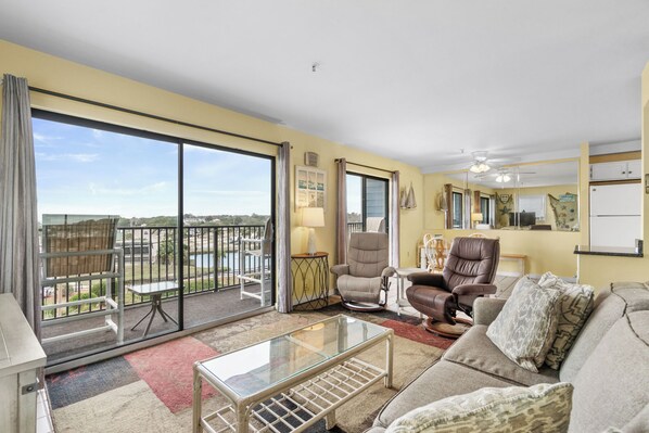 After a day of exploring all Myrtle Beach has to offer, unwind in the comfortable bedrooms. The master suite features a cozy queen-sized bed and a private en-suite bathroom, perfect for relaxing in privacy. The second bedroom, complete with twin beds, is ideal for kids or additional guests. A second full bathroom ensures plenty of space for everyone to refresh after a day of beachside fun.