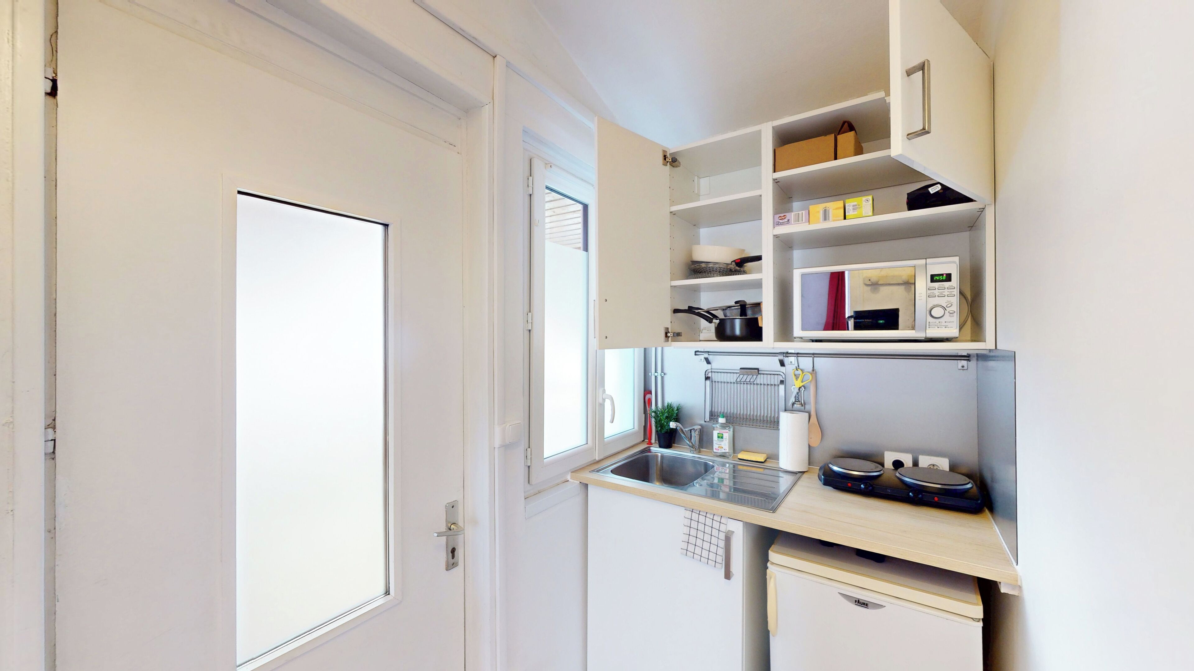 - Une cuisine ouverte sur le séjour et entièrement équipée : bouilloire électrique, grille-pain, plaques de cuisson et cafetière