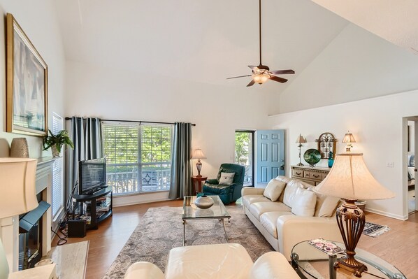 La pièce principale offre une sensation ouverte et spacieuse avec un plafond voûté avec ventilateur. Le palier à l'étage donne sur le salon. Grand canapé en coupe et une grande télévision à écran plat HDTV. Nous vous proposons des films DVD gratuits destinés aux familles et que vous apportez vos propres favoris. Internet très haut débit avec commodité WiFi gratuite.