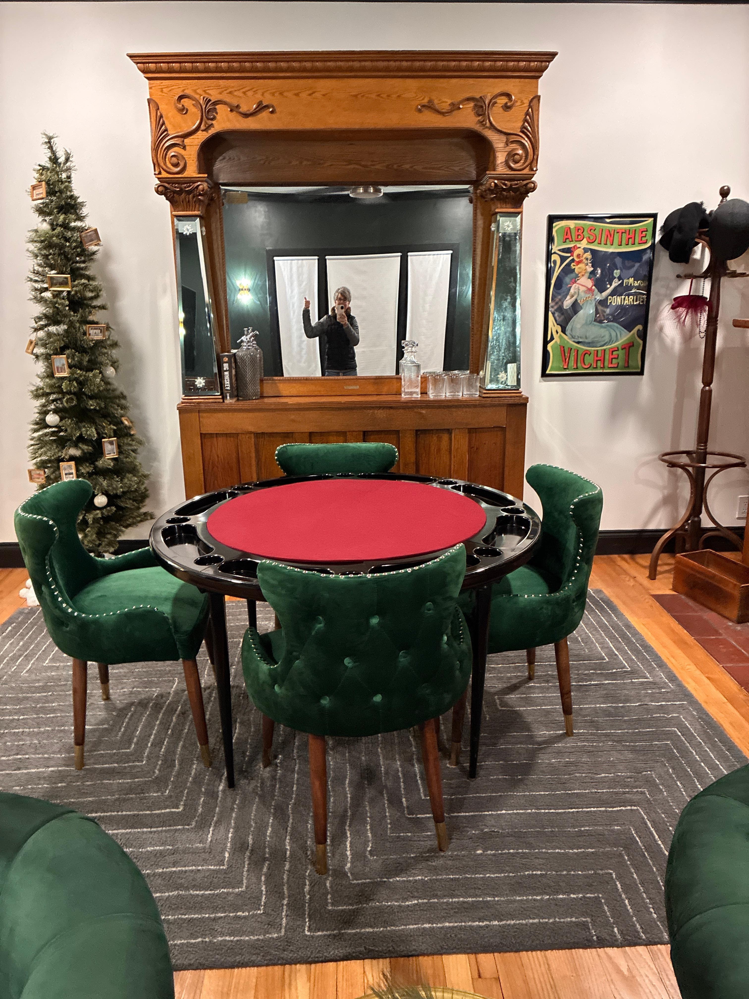 Poker table, plush velvet seating, bar area