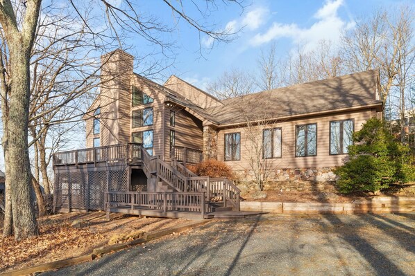 Whispering Elm, with 15 stairs to entry, is located at the top of the mountain in close proximity to fabulous hiking, skiing, the Devils Knob Golf and Racquet Center, and The Spa, Aquatics and Fitness Center. The main level of the home offers an open floor plan living area with cathedral ceilings, a wood burning fireplace, a dining room with a large table that seats 10 and a spacious kitchen with counter seating. A wrap-around deck surrounds the main living area and provides seasonal views of the Blue Ridge Mountains. A screened porch is located off the dining room with lounge seating. The main level features two bedrooms. The main-floor master bedroom has a king size bed, walk-in closet and a private bath with a tiled shower. The second main floor bedroom has two twin beds and direct access to a bathroom with a tiled shower. The main level also features an office/den. The upper level includes a king master bedroom, private deck, and private bathroom with a jetted tub. The upper level also includes a kid’s suite that has one queen bed, two twin beds, a ½ bath, and an alcove play area.