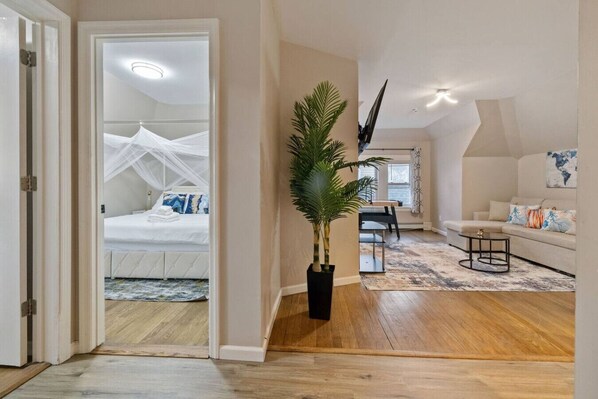 Welcome to NJ and the East Orange Neighborhood. This modern 3rd-floor walk-up apartment offers a clean, comfortable layout. The main bedroom features a king bed, Smart TV with streaming capabilities, and a dedicated workspace with fast WiFi. The racing-themed kids` room adds a fun touch for younger guests, while the living area includes an air hockey table, Smart TV, and a sofa that can sleep an additional guest. The full kitchen is equipped with all essentials, including a Keurig, full-size modern appliances, and a dining table for four. Large windows provide natural light throughout, giving the space a calm, inviting feel. Perfect for extended stays or weekend visits.