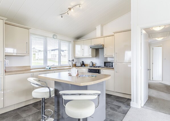 State of the art contemporary styled lodge with one master double, with contemporary en suite shower and two twin. Bathroom with bath with overhead shower. Spacious open-plan living space with 40" flatscreen TV and stylish modern kitchen with washing machine set beside an elegant dining area. Patio doors leading to spacious outdoor decking. Ideal for a holiday with family or friends to celebrate any occasion. No pets.