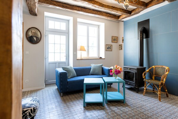 - Salon avec poêle à bois et TV