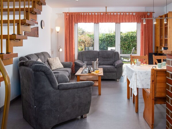 "Nordlicht", maison mitoyenne 4 pièces 70 m2 sur 3 niveaux, au rez-de-chaussée. Aménagement agréable et plaisant: séjour/salle à manger 22 m2 avec Télévision numérique, écran plat et radio. Sortie sur la terrasse. Cuisine ouverte (4 plaques de cuisson, four, lave-vaisselle, grille-pain, bouilloire électrique, micro-ondes, cafetière électrique). WC séparé. À l'étage supérieur: 1 chambre 10 m2, mansardée avec 1 lit double (2 x 100 cm, longueur 200 cm). 1 petite chambre 6 m2, mansardée avec 1 lit (90 cm, longueur 200 cm). Douche/WC. Sous le toit: (escalier raide) 1 petite chambre 12 m2, mansardée avec 2 lits (90 cm, longueur 200 cm). Petite terrasse, pelouse. Meubles de terrasse. A disposition: chaise haute pour enfant (en sus). Internet (Connexion WIFI, gratuit). Veuillez noter: maison non-fumeur. Maximum 1 animal/ chien autorisé. Détecteur de fumée.