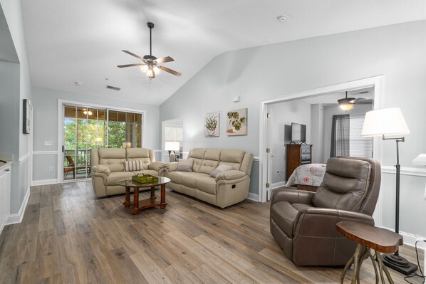 The handsome Master Bedroom has a traditional king size bed and sitting area complete with a large ensuite master bath, flat screen TV, walk-in closet and ceiling fan. The second bedroom has 2 twin beds and the third bedroom has a queen size bed. Both have flat-screen TV's, ceiling fans, dressers and closets and share an adjacent bathroom with tub/shower. For your convenience, there is a laundry room with full size washer/dryer.