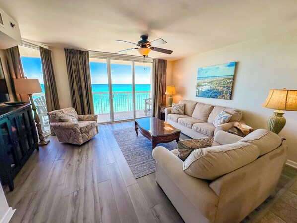 Enjoy relaxing in the open living area featuring a flat-screen TV, ceiling fan, and comfortable furnishings—ideal for unwinding after a day on the sand. Step out onto the expansive 26-foot private balcony, accessible from the living room and master suite, where you can enjoy sunrise coffee, ocean breezes, and breathtaking views of the Atlantic. The fully equipped kitchen includes granite countertops, a microwave, dishwasher, and all the essentials for easy vacation meals, plus a full-size washer and dryer for added convenience on longer stays.