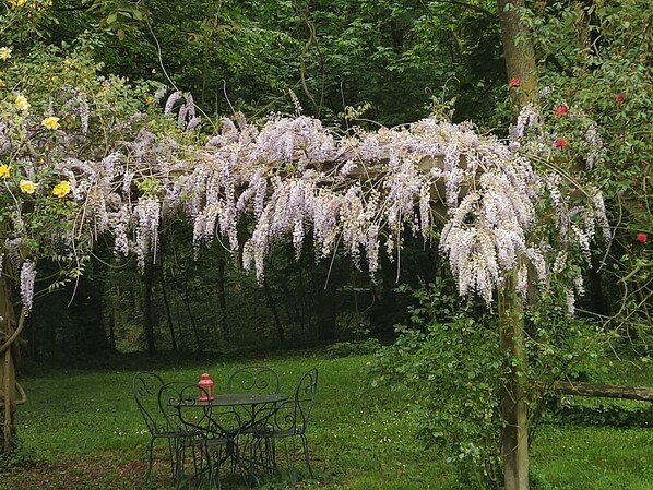 Gîte de caractère situé au calme, dans un cadre verdoyant et arboré (séquoia, chêne, pin noir), dans le parc d'une propriété du XIXème (maison du propriétaire à 100 m). Jardin arboré non clos (1000 m²) avec terrasse. Portique, ping-pong, bac à sable, terrain de pétanque à disposition. Promenades dans le bois de la propriété.