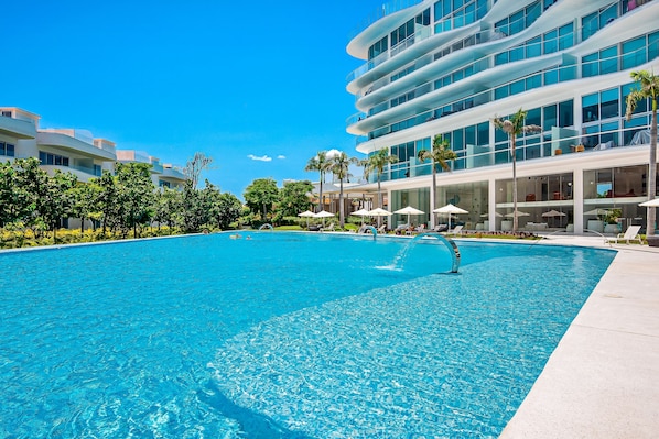 Luxe condo with infinity pool, fitness center, sweeping vistas, and central AC