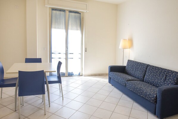 Description : first floor with lift. Completely refurbished. Living room with double sofa bed, dining table and new kitchenette - bathroom with shower box - double bedroom - balcony on two sides.