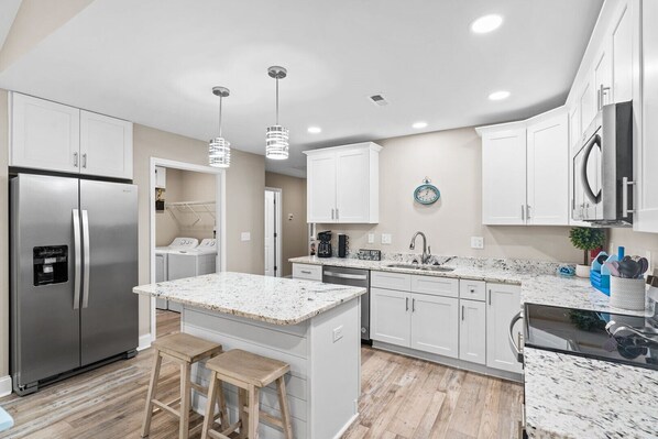 Introducing the newest, cleanest and most modern vacation rental beach house to the Oak Island rental market, and it is waiting just for you!  Feisty Turtles has arrived!  Situated just a few blocks from the sand and surf, this 2023 built 3BR/2BA home (BR1:1Q, BR2:2T, BR3:2T) has it all including luxury vinyl plank flooring, granite countertops, stainless steel appliances, vaulted ceiling and plenty of space for everyone to chill out after a long day in the sun!  An oversized garage provides room for all of your gear during your stay, or perhaps a golf cart rental to explore the island with. You will also find an outside hot & cold shower which is the preferred spot everyone wants first.  After you clean up, relax with a cold drink in the screened porch while planning your next day on the water. Located just one block from the new bridge providing easy access to all of Oak Island’s services and amenities but also Southport, Wilmington and Myrtle Beach.  New, clean, great location, plenty of space and affordable!  Book your next memory making vacation in Feisty Turtles now before someone else does! No Smoking, No Pets. Departure maid service included, linens quoted extra. 3-night minimum rates available in all Seasons. Check-In: 3-5PM Check-Out: 10:00AM.
