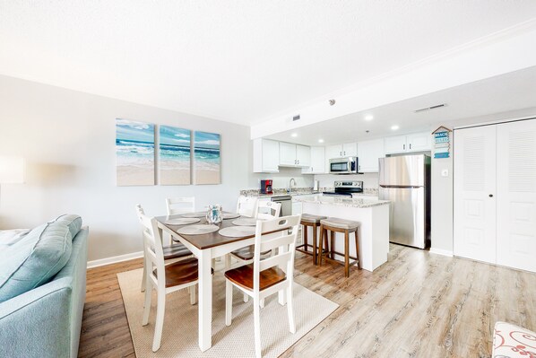 When you have had your fill of vitamin D, downtime will be a dream with central AC to cool off in, an open layout designed with entertaining in mind, and modern updates throughout. The living room will be a great place to kick back and watch a movie on the flatscreen TV, especially when you open the sliding glass doors to let the cool breeze in. Dining out is always an option, but there really is nothing like a homecooked meal prepared in the full kitchen. And, as days come to a close, everyone can gather at the accommodating dining table to reminisce about the fun of the day.