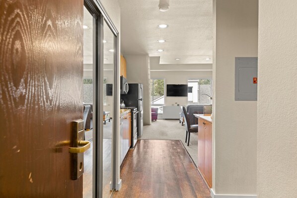 • Downstairs is a dining area, kitchenette, bathroom and living space with valley views at Palisades Tahoe Lodge.