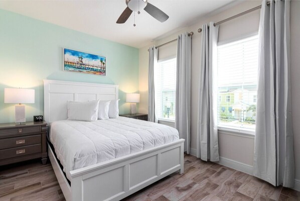 This is a family friendly resort full of amenities that adults and children alike will enjoy. The cheery aesthetics of this bright blue Villa blends seamlessly with the sunny blue skies above. The sun doesn't stop there, as you step inside this glowing new space, your home away from home. Sunset Walk is very unique and just a 10 min stroll away. There are a ton of restaurants, retail, a movie theater, live music and a waterpark.