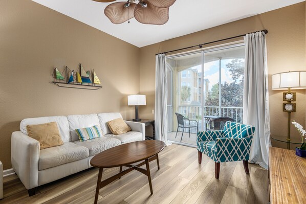 Le salon dispose d'une grande télévision par câble à écran plat avec une console PlayStation 4 et des sièges confortables. Le salon a également des portes coulissantes en verre à l'écran dans lanai. L'espace salle à manger se trouve juste à côté du salon, ce qui rend le temps familial facile et pratique. La table à manger doit s'asseoir pour 4 personnes. La cuisine entièrement équipée dispose d'un réfrigérateur en acier inoxydable et d'un lave-vaisselle pour nettoyer la brise.