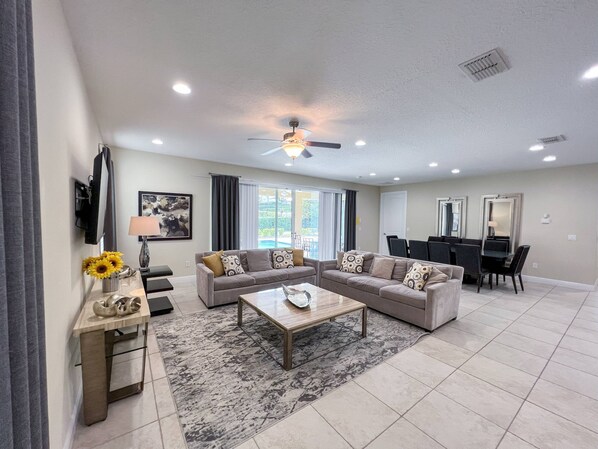 * Tastefully furnished living room with flat-screen TV and
