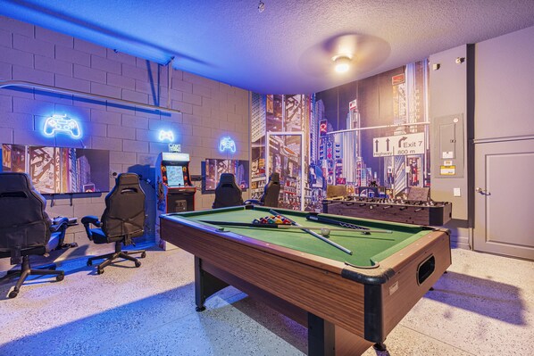 * Game room includes pool table, foosball, arcade machines, gaming