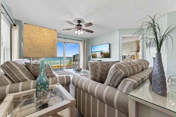 Inside Sea-esta, you'll find a fully equipped kitchen—perfect for cooking beachside breakfasts or sunset dinners. The oceanfront master suite features a plush king bed, ensuite bathroom, spacious closet, and sweeping shoreline views. The guest bedroom also has a king bed, ideal for family or friends, and the living room includes a memory foam sleeper sofa for additional accommodations. For added convenience, the condo includes a full-size washer and dryer, plus a starter supply of essentials.