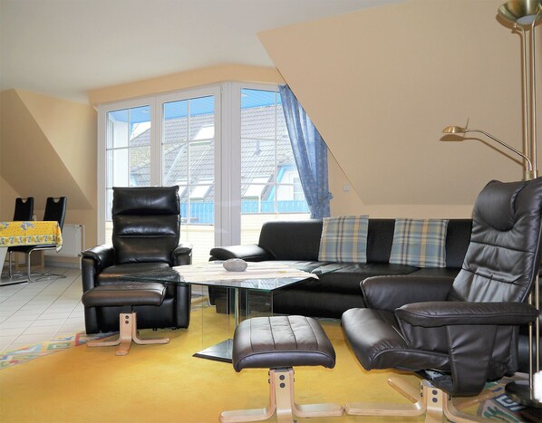 Appartement jusqu'à 4 personnes | environ Surface habitable de 90 m2 | Salon OG avec kitchenette, salle de bains, 1 chambre à coucher | Bain DG, 1 chambre à coucher | Loggia Ouest | 1 place de parking | Coin salon Table à manger, canapé, radio avec lecteur CD, télévision par satellite | Kitchenette Four, lave-vaisselle, cuisinière, cafetière, réfrigérateur avec congélateur, grille-pain, bouilloire 2 salles de bain, toilettes au premier étage | Douche, toilettes dans le grenier Machine à laver | 2 chambres à coucher 1 lit double (180 x 200 cm) à l'étage supérieur | 2 lits simples (90 x 200 cm) dans la DG | Incl. Linge de lit, serviettes, chaise haute, lit Voyage, machine à laver, WLAN