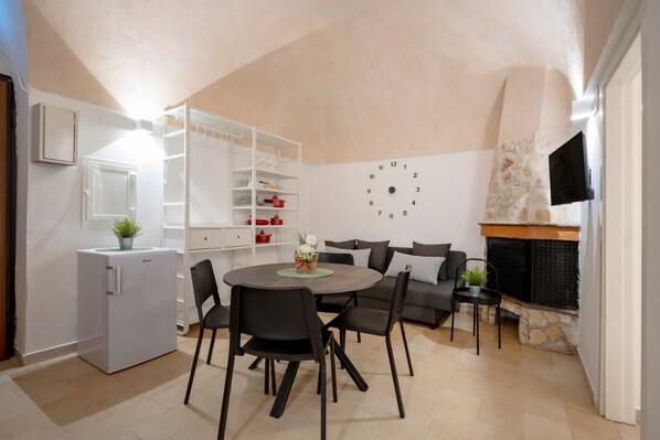 - LIVING ROOM with sofa, TV and dining table with chairs, split A/C;