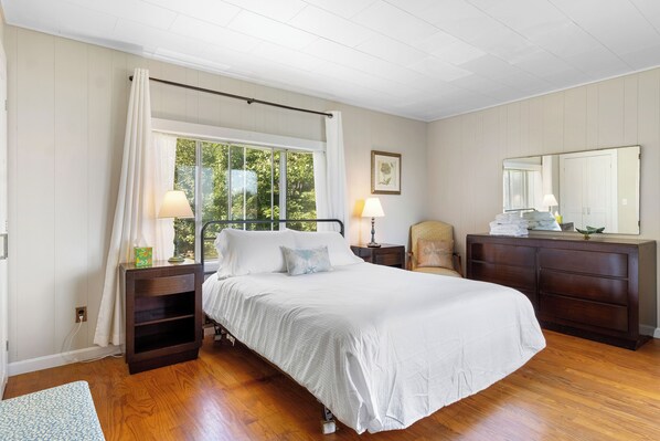 On the first floor, a spacious queen bedroom includes a private balcony overlooking the shimmering waters perfect for enjoying morning coffee or evening sunsets. The newly renovated full bathroom features an oversized walk-in shower, adding comfort to your stay.