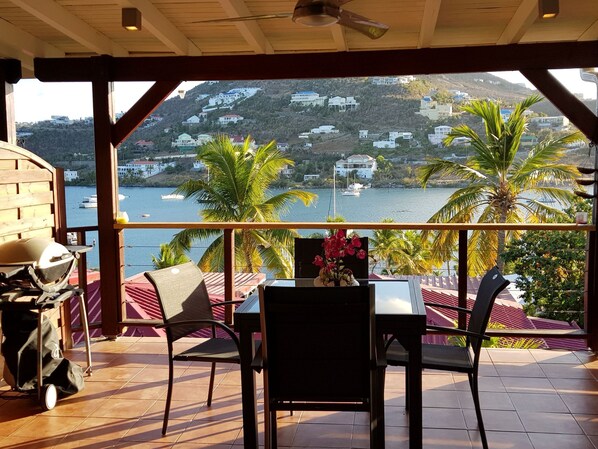 Ce bungalow dispose d'une terrasse privée avec une vue magnifique sur la baie d'Oyster Pond.