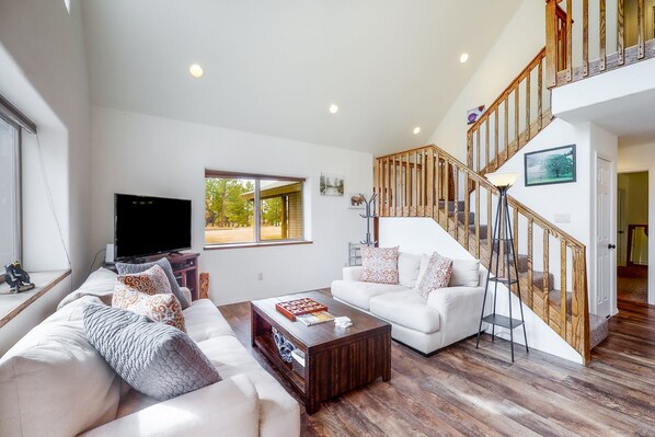 Plan your next vacation to this lovely, three-bedroom-plus-loft home in Pagosa Springs, where generous windows let in gorgeous sunshine and highlight all the comforts of home.