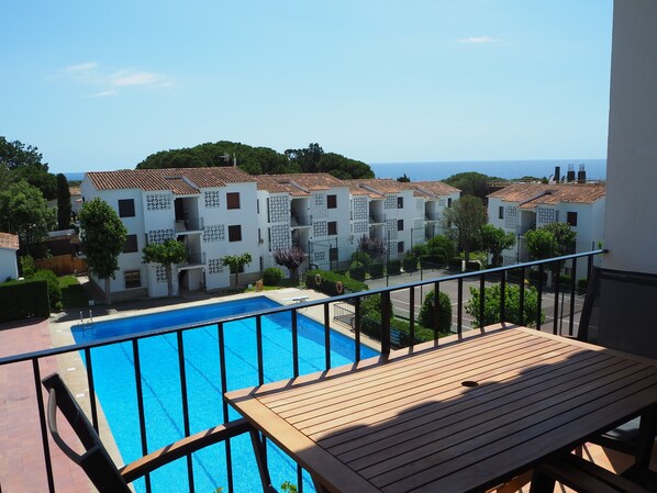 Appartement avec vue piscine et mer.