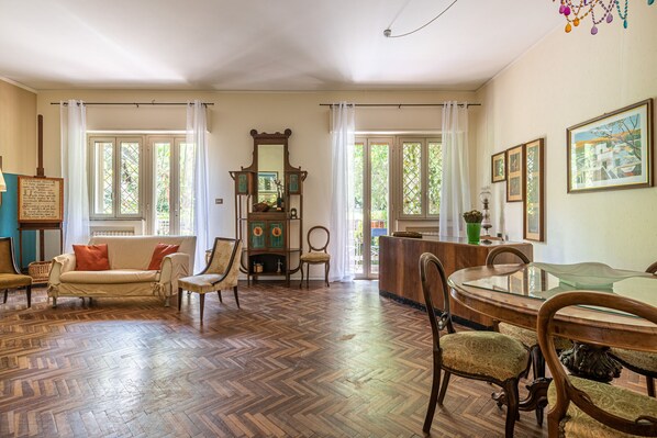 The house is surrounded by a charming private garden, fully furnished and in bloom, where guests might spot friendly tortoises. Walking up the building’s stairs, you’ll reach the entrance that opens, on the right, to a spacious and bright living room decorated in a classic style, with paintings and vintage details, featuring two comfortable sofas and a dining table, perfect for meals, working or studying. From the living room, guests have direct access to the garden, fitted with a gazebo, pergola and a table for outdoor breakfasts. An eat-in kitchen, bright and equipped with everything you need, completes the living area.