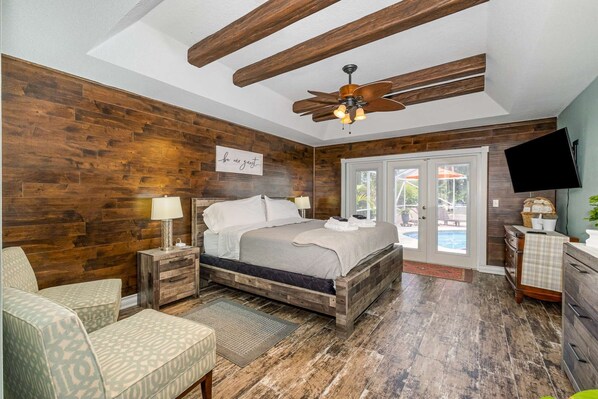 The master suite showcases stunning wood beams across a recessed ceiling and offers a luxurious king bed adorned with sumptuous linens. The en-suite bathroom features an oversized shower for ultimate relaxation. The second and third bedrooms—housing a pair of twin beds and a queen bed, respectively—are thoughtfully located on the opposite wing of the home for maximum privacy.