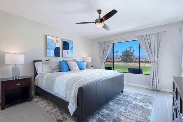 The primary bedroom features a king bed, large closet, ceiling fan, access to the patio, and spectacular views of the golf course and mountains. The guest bedroom features a queen bed, closet, ceiling fan, and a half bath.