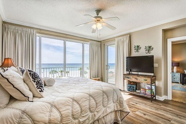 The open layout is perfect for a beach getaway featuring gulf views in the living/dining room, master bedroom and breathtaking views on the private balcony. The gulf front master bedroom has plenty of space even with the KING size bed. Enjoy the convenience and solitude of an attached private bathroom with a walk in shower, separate large tub and walk in closet! The 2nd bedroom offers a QUEEN size bed, closet for storage and access to the 2nd bathroom. The 3rd bedroom has a TWIN OVER FULL bunkbed. All 3 bedrooms and the living room are equipped with flat screen TV's. For the common space you have an open living/dining and kitchen. The living room has a sleeper sofa. The kitchen is fully stocked with stainless steel appliances and everything you need to cook during your stay. The dining area has a dining table and bar seating for extra space. This condo does have a full size washer and dryer.