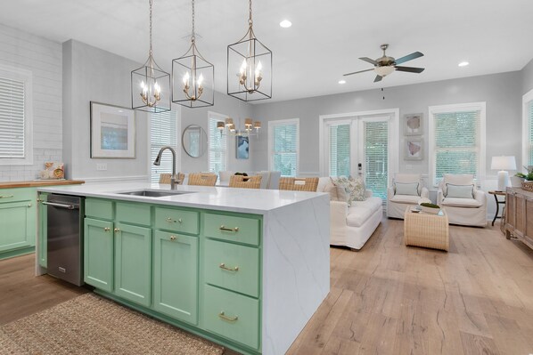 Take a break from the ordinary at Dock Holiday! This fully remodeled 4 bedroom, 3 bathroom home is located in the popular 30A community of Seacrest Beach. Situated only 880yds from beach access and mere walking distance to Rosemary Beach, this stunning home offers a bright, open floor plan with elegant, coastal vibes. You will love the gorgeous hardwood flooring throughout, contemporary furnishings, and a gourmet kitchen with butcher block counters, marble waterfall island and stainless-steel appliances. There is a guest queen bedroom on the first floor with a private attached bathroom and patio access. The luxurious master bedroom on the second floor features a king bed, a day bed with trundle, balcony access, and a private bathroom with a large walk-in shower and two separate vanities. The second floor also includes a queen bedroom with an attached private bathroom, balcony access, and a bunk room with twin bunks. Sip your beverage of choice on one of the covered porches, take a dip in the huge community pool, or ride the seasonal tram to the beautiful beaches! You will also find two dedicated parking spots, 4 bikes, and a Pack 'n Play. Make Dock Holiday your next beach vacation tradition!
