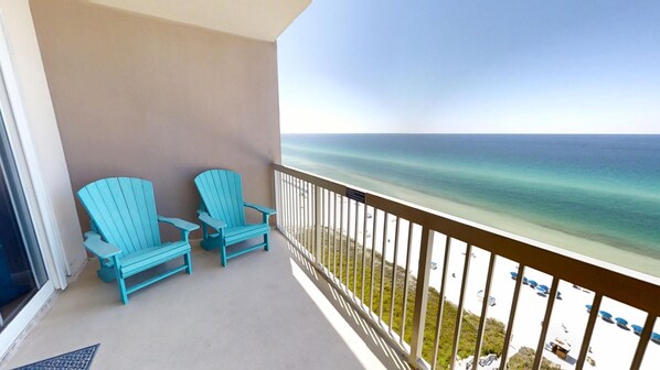 Inside, the open-concept living area is a coastal haven with wood flooring, beach-themed décor, and a large flat-screen TV atop a driftwood-style entertainment center. Floor-to-ceiling sliding doors open to a private, oversized balcony furnished with a high-top table for two, two sun loungers, and two Adirondack chairs—the ideal place to take in the gulf breeze and endless white sand views.