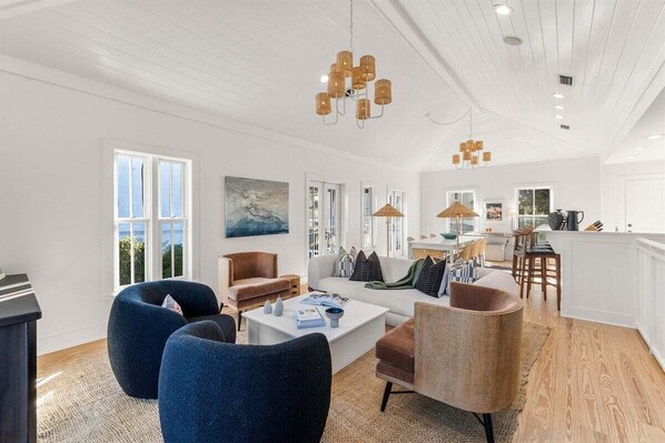 - Open concept. The living room, dining, and kitchen blend seamlessly featuring plenty of space for your whole crew to hang out, plus a large dining table for eight.