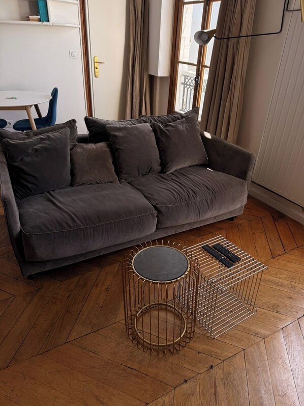 This charming 36-sqm apartment is situated on the 6th floor of a historic building without an elevator. The living area features a sofa, flat-screen TV, and dining table with chairs, making it a versatile space for relaxing, dining, or working remotely. The high-speed Wi-Fi connection (1 Gbps) ensures smooth video calls and uninterrupted streaming.