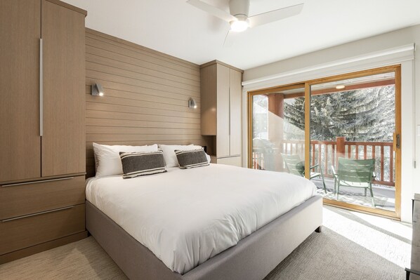 The main bedroom is modern and crisp, with a luxurious king-sized bed in front of built-in wooden paneling and cabinetry and finished with plenty of storage, a flat screen TV/DVD combo, and beautiful wood furnishings. Floor-to-ceiling windows brighten the room and lead you to a private patio. The private en-suite bathroom is spacious and bright with custom wooden shelving and cabinetry, heated floors, and finally the glass enclosed power-shower.