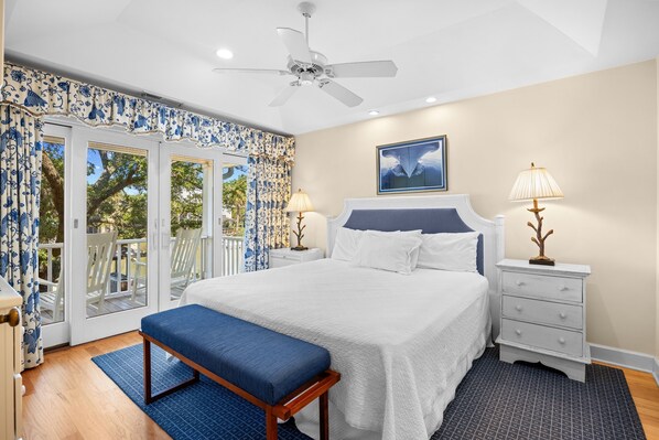 ÉTAGE PRINCIPAL: (3 chambres à coucher) 1 ROI, 1 REINE, 2 SIMPLES, 3. 5 salles de bain complètes, cuisine à aire ouverte, salle à manger, salon s'ouvre sur une véranda couverte pleine longueur avec grill Viking intégré et vue sur le marais salant, salle avant w / table de jeu, escalier intérieur au rez-de-chaussée.