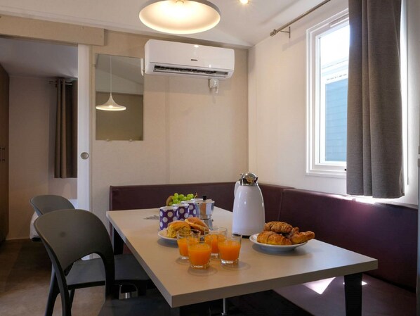 "Happy Relax", 3 pièces mobil home 25 m2. Logement idéal pour 4 adultes + 1 enfant. Aménagement fonctionnel: séjour/salle à manger avec chauffage électrique et air-conditionné. 1 chambre avec 1 grand-lit (140 cm, longueur 190 cm). 1 chambre avec 1 x 2 lits superposés (70 cm, longueur 190 cm), 1 lit gigogne (1 pers. longueur 175 cm). Cuisine ouverte (4 plaques de cuisson). Douche/WC. Air-conditionné (en sus). Terrasse partiellement couverte. Meubles de terrasse, barbecue électrique (portable), chaises longues (2). Place de parking (1 Voiture), garage. Veuillez noter: logement non-fumeur. IT023059B1N99WJV2I