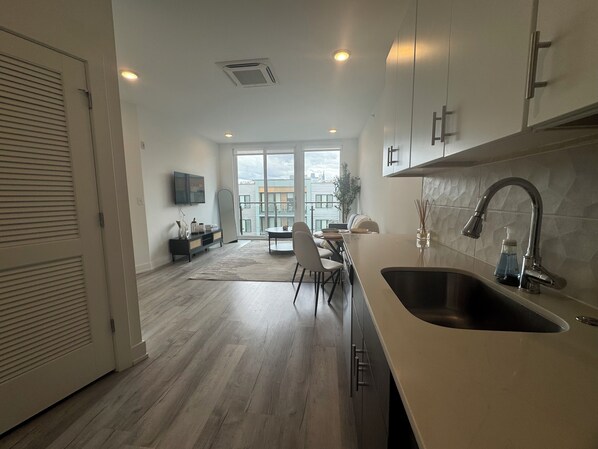 Step inside to a bright, open living space with chic décor and inviting touches. The thoughtfully designed layout provides a perfect place to relax, whether you’re catching up on work, streaming your favorite shows, or unwinding after a day in the city.