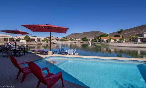 Nouveau sur HomeAway et VRBO. com! Profitez de station de luxe tous les jours et le style de vie en plein air environnant par de superbes montagnes et le lac des panoramas. Cette belle maison de plain-pied a été récemment rénové avec 3 chambres 2 salles de bains plus un den avec futon pour les invités supplémentaires au besoin. style Resort piscine nouvelle chauffable et un bain à remous en font une expérience agréable ronde de l'année. Parfaitement orienté au nord, la cour arrière capture les vues sur le lac et la montagne de tous les domaines pour votre plus grand plaisir de visionnement depuis tous les espaces de vie principaux! Le système domotique Amazon Echo vous permet de demander à "Alexa" de jouer de la musique, d'allumer ou de changer les couleurs d'éclairage de la piscine, de vérifier les conditions météorologiques, d'allumer et de raconter une blague ou 2! Calme maison cul-de-sac dans une communauté élégante fait un calme, escapade réparatrice parfait. Cette maison est livrée avec des téléviseurs intelligents dans toutes les chambres, un téléviseur 55 pouces intelligent dans une grande pièce est un téléviseur 3D avec système de son Home Cinéma, Blu Ray avec des lunettes 3D et des films fournis, un téléviseur Smart 50 pouces dans la chambre principale avec Blu Ray, Tivo, Internet haut débit Wi-Fi 2G et 5G, Sony Playstation 4 et 2 et un système de jeu Nintendo Wii et un grand choix de jeux ;, ordinateur de bureau et copieur / imprimante dans la tanière avec un large assortiment de jeux fournis. Vaste collection de musique et de DVD et jeux de société pour le plaisir de la famille. Un flipper à 2 joueurs et une petite bibliothèque pour votre plaisir de lire. Cette maison est équipée de tout le nécessaire pour rendre votre séjour agréable, y compris un coffre-fort pour vos objets de valeur. Lingerie de luxe à filetage élevé pour améliorer votre sommeil, Machine à glaçons et distributeur d'eau automatiques à travers la porte du réfrigérateur. Grande pêche sur le quai, cannes à pêche fournies. Incroyable randonnée sur les vastes sentiers de randonnée à quelques pas de la maison. À distance de marche de Legends at Arrowhead, un parcours de golf conçu par Arnold Palmer. Grands restaurants à proximité. GPS fourni préchargé avec la destination d'origine et les restaurants locaux. Courte distance des épiceries et des magasins à proximité. gestionnaire de la propriété et les propriétaires vivent à proximité pour un accès facile. Bienvenue sur le mode de vie Arrowhead Lacs! Vous ne voudrez pas rentrer à la maison!