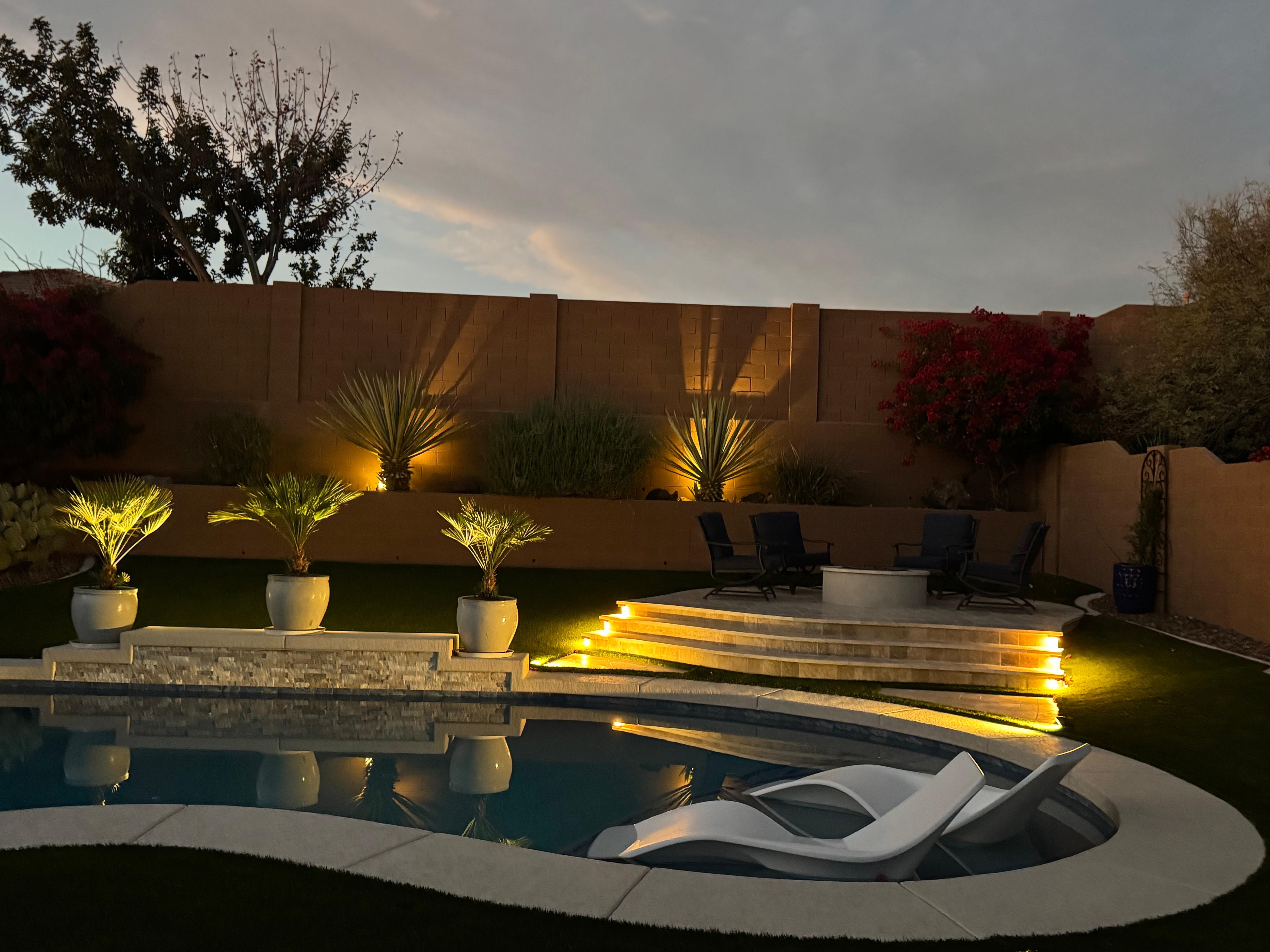 Lush green turf surrounded by desert landscaping and privacy walls