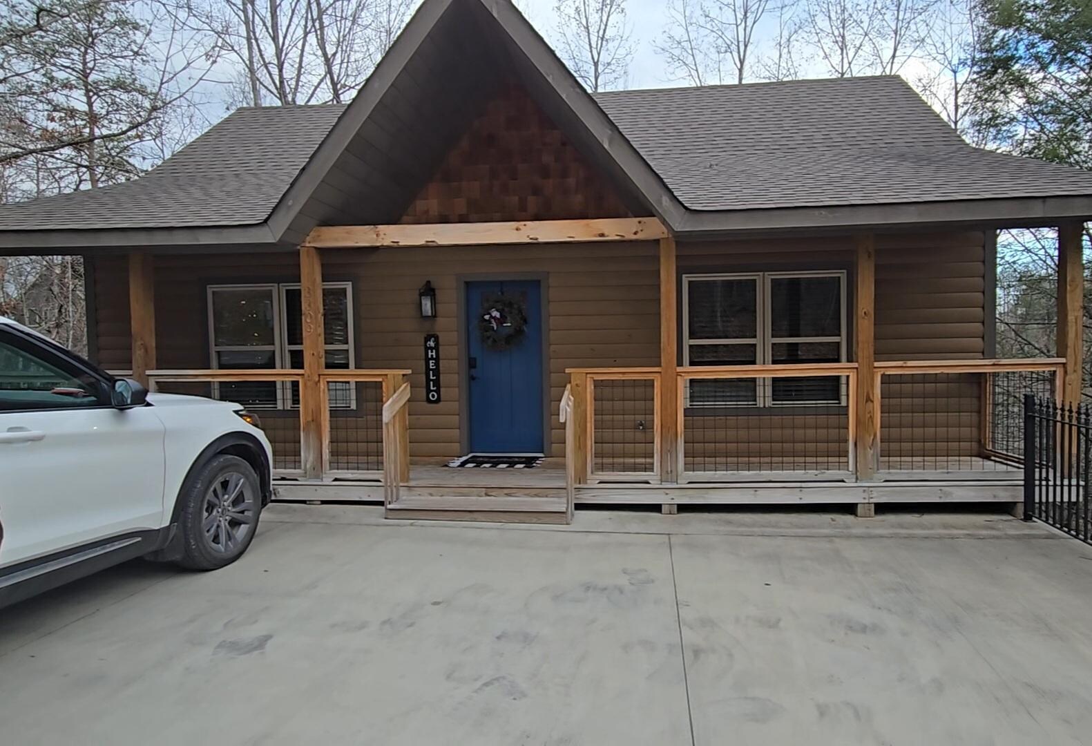 Kestrels Keep is an amazing, two bedroom cabin rental located in the heart of Pigeon Forge, that will please the whole family. We offer two huge king bedrooms, each with their own electric fire place, television, and ensuite bathrooms, featuring huge walk in showers. The upstairs living area offers a cozy setting with an electric fireplace, and fuzzy blankets! Downstairs is another living area equipped with a television and comfortable couches, a foosball table, and a set of bunk beds. Each level has a large deck with seating for all, while the lower deck is where you will find the hot tub! While open fires are not allowed in the community, there is a propane fire pit table that is perfect for making s'mores on the upper deck, as well as a propane grill; propane is provided for both. The kitchen is fully equipped with everything you will need, including three different ways to make your favorite coffee: a coffee pot/Keurig combination and a French Press. Have a little one with you on vacation? There is a collapsable baby bath, high chair, pack n' play, baby gate, and dinnerware all to help accommodate our tiniest of guests. Down the hill from the house is where the community pool is located, which is in operation starting Memorial Day Weekend through Labor Day Weekend. There is also a basketball goal located near the pool, which is accessible year round.