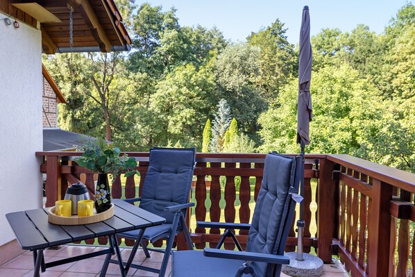 De plus, cet appartement dispose d'un espace extérieur privé avec un jardin et un balcon.