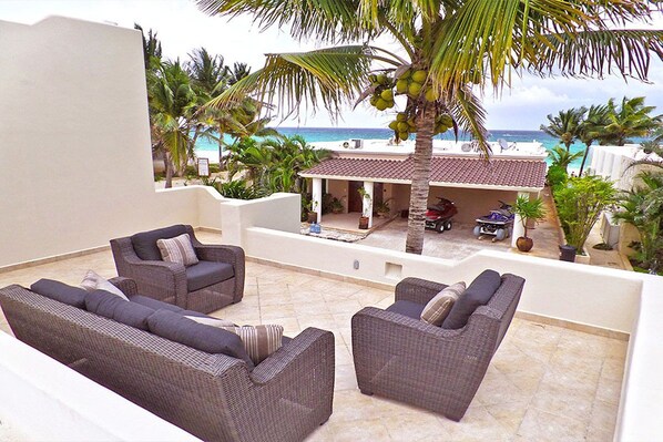 This villa accommodates up to 12 guests with its four graciously appointed bedrooms with 4 king-sized beds each with en-suite baths. The king-sized master bedroom features a lovely furnished terrace with ocean view. A sweet little second floor studio contains 1 queen sized sofa sleeper as well as an additional ocean-view terrace. On the lower level we have a small back room we call our children's room. This is a perfect space to sleep two small children where they too can enjoy the luxury of AC and a full bathroom for their comfort.