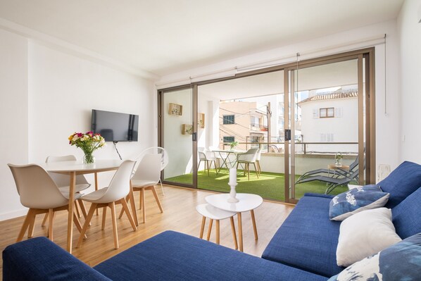 Apartment on the beach Puerto Pollença. Apartment Mateo is located just 50 metres from the sandy beach of Port Pollensa. The building has been refurbished in 2020 and the apartment in 2022 . Apartment Mateo offers a spacious, sunny balcony, a modern living/dining room with open plan kitchen and two bedrooms. Beach bars, restaurants and shops are just around the corner, mainly by the sea. The surf and sailing school Sail & Surf offers courses for different age groups.